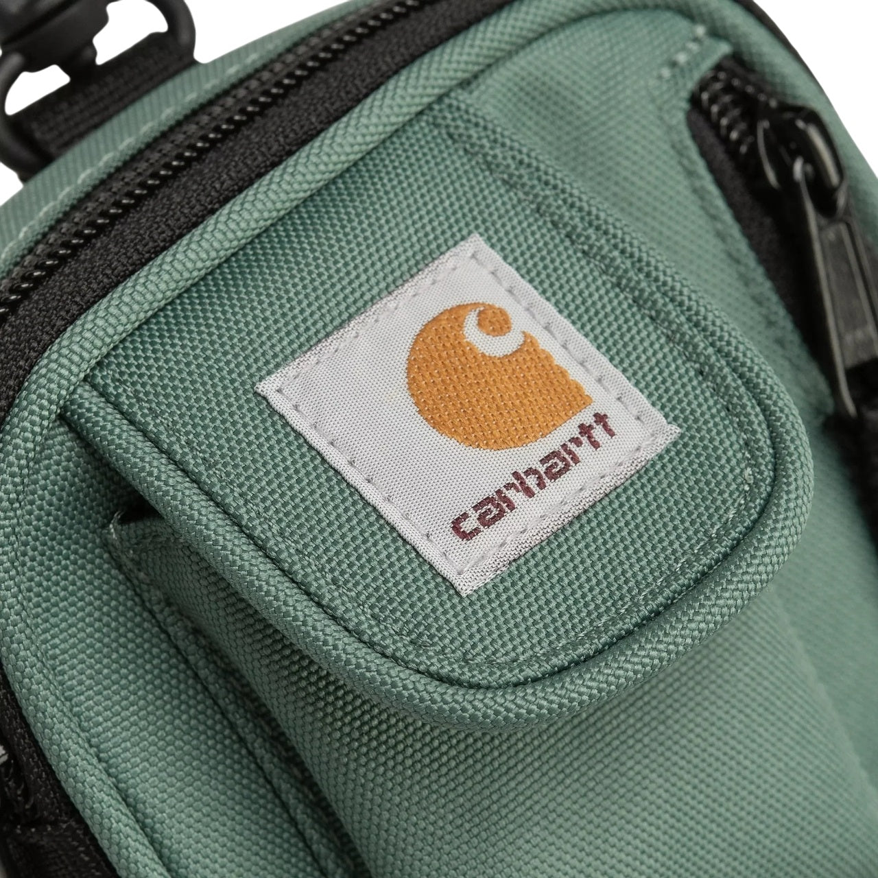 O visual é rematado com a discreta e icónica etiqueta quadrada Carhartt WIP, sublinhando a identidade utilitária da marca.